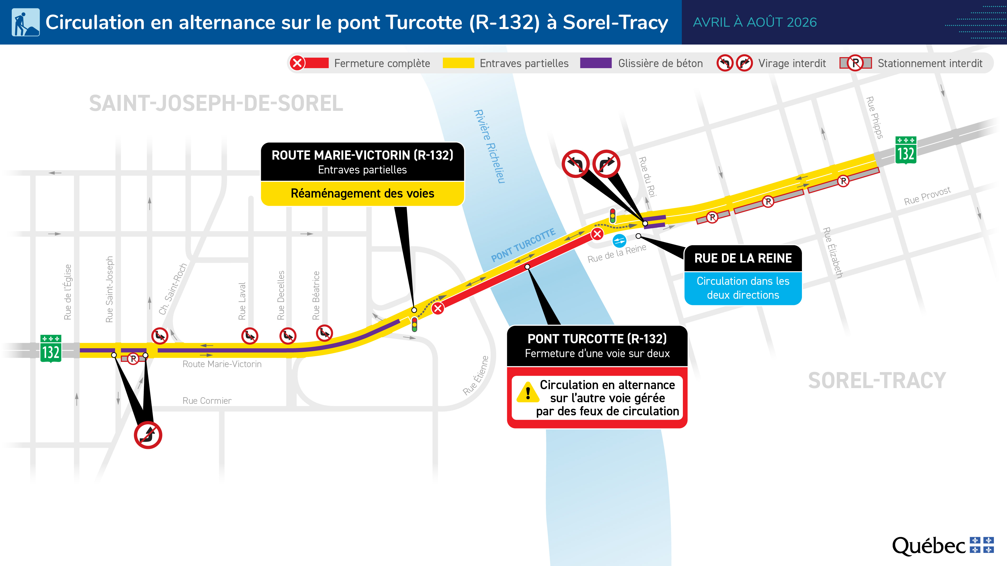 Celle-ci occasionnera de la circulation en alternance sur la seule voie disponible sur la structure, dès le 13 avril, 6 h, et ce, jusqu'à la fin du mois d'août prochain. La nouvelle configuration du chantier nécessitera également l'installation de glissières de délimitation des voies de circulation sur une portion de la route 132, de part et d'autre du pont. Conséquemment, il ne sera plus possible d'effectuer des virages à gauche ni de traverser la route 132 aux intersections avec les rues Béatrice, Decelles, Laval et du Roi.