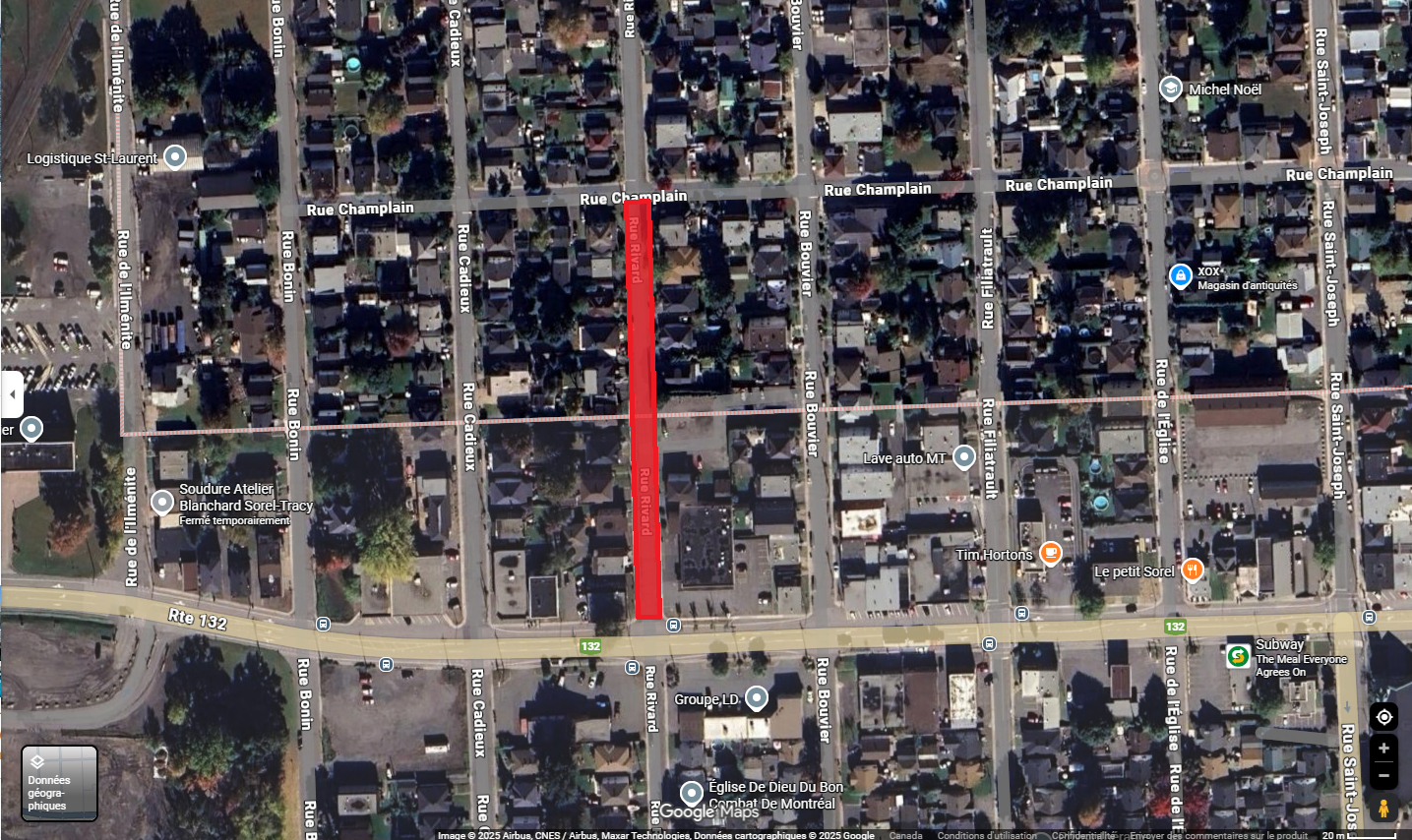 Une entrave à la circulation sera en vigueur sur la rue Rivard, entre la route 132 et la rue Champlain, pour une durée de 2 à 3 jours à compter du jeudi 4 décembre. Un chemin de détour sera mis en place.