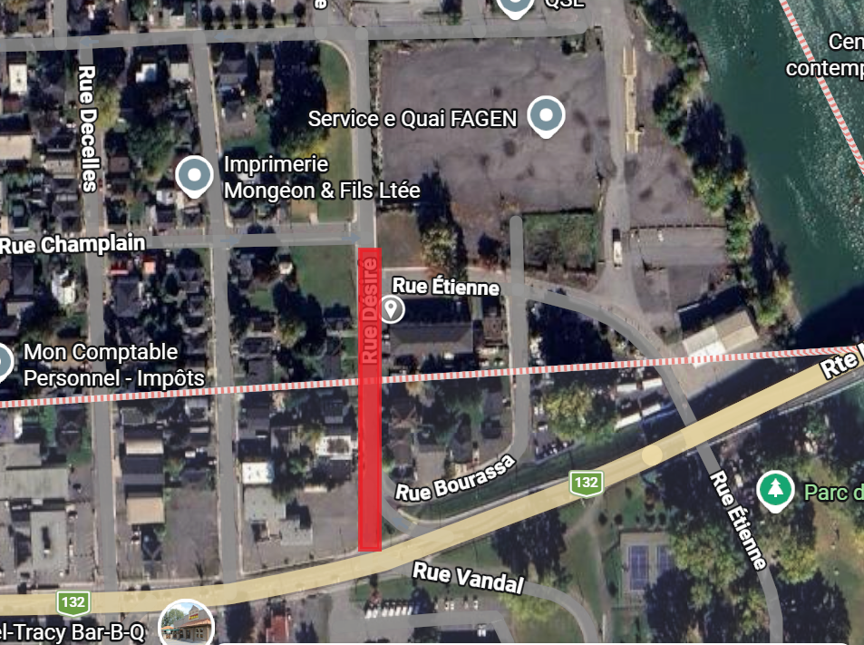 Une entrave à la circulation sera en vigueur sur la rue Désiré, entre la Route 132 et la rue Champlain, pour une durée de 2 à 3 jours à compter du mardi 21 avril. Un chemin de détour sera mis en place.