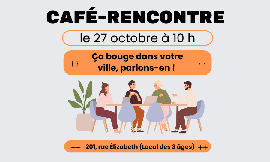 Tous les citoyens sont invités au café-rencontre, ce dimanche 27 octobre 2024 à 10 h, au centre communautaire (201, rue Élizabeth).